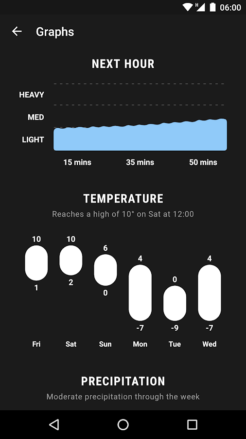 Weather Timeline is a simple weather app that focuses on summarising the next hour, the next 48 hours and the next week so you don't have to. It presents the forecast in a timeline to help you quickly glance and digest the information and has a strong focus on color to outline the weather conditions. The app includes current weather alerts/warnings for your chosen locations and includes a time machine weather forecast so you can look at the forecast months, even years in advance or check what the weather was like several decades ago.